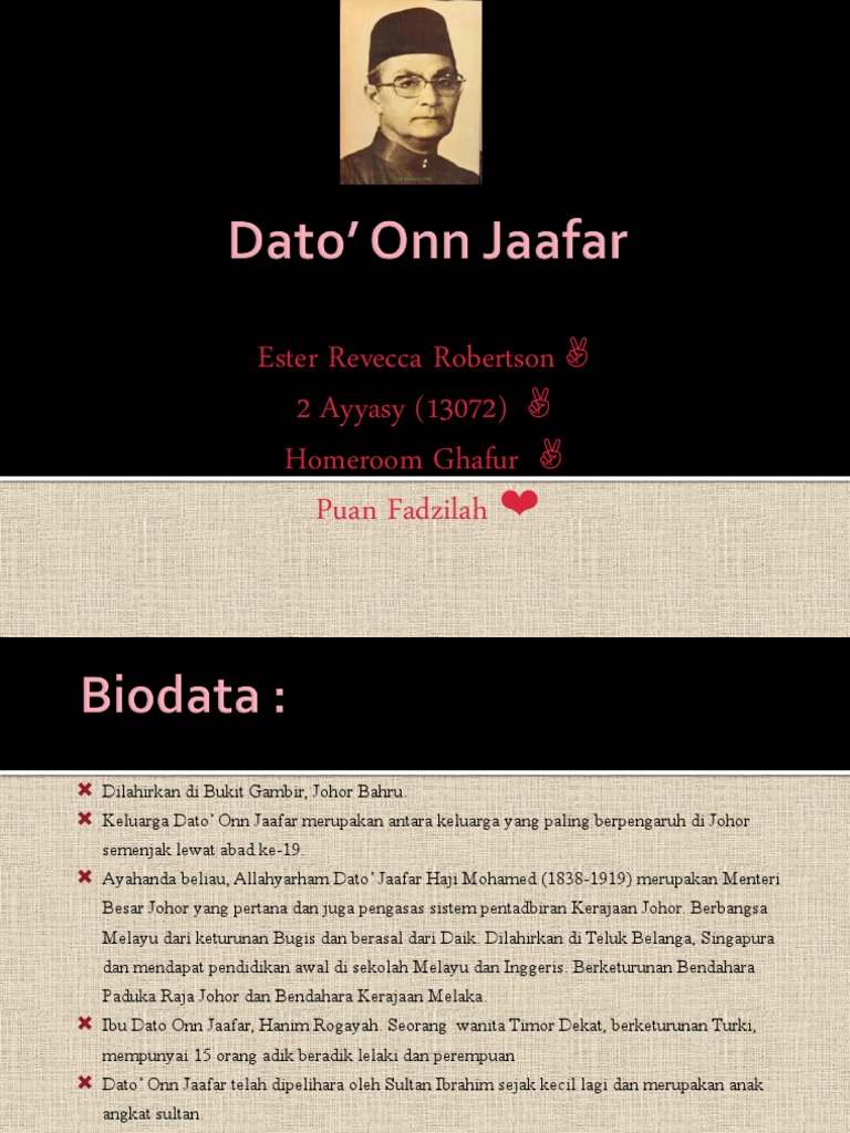 Dato' onn jaafar on wn network delivers the latest videos and editable pages for news & events, including entertainment, music, sports, science early malay nationalism took root in johor during the 1920s as onn jaafar, whom sultan ibrahim had treated as an adopted son, became a journalist and. He is also the founder and was the 1st president of united malays national organisation (umno). Datuk onn jaafar di lahirkan pada tahun 1895 di bukit gambir, jalan gertak merah, johor bharu. Aynı zamanda kurucusu ve birleşik malezya ulusal örgütü 'in (umno). Sekolah dato jaafar red pastel a.